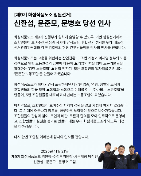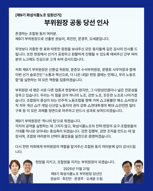 제9기 화섬식품노조 임원선거 당선 인사 작성자 교선국장 작성일25-11-24 00:33 0 조회수 86 공유하기 공유하기 URL 복사 본문 . 첨부파일 1.jpg (1.0M) 2회 다운로드 | DATE : 2025-11-24 00:33:29 2.jpg (1.1M) 2회 다운로드 | DATE : 2025-11-24 00:33:29 다음글제9기 화섬식품노조 임원선거 당선인 공고 목록